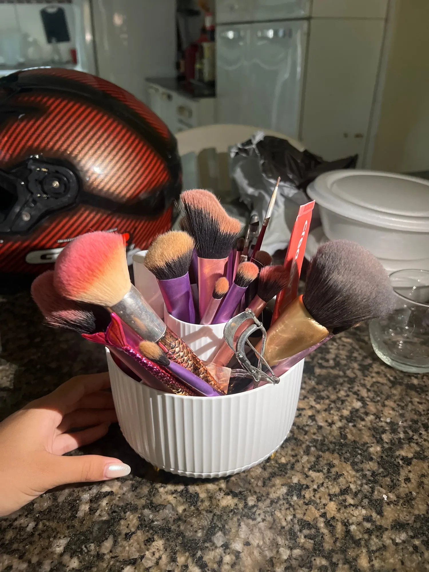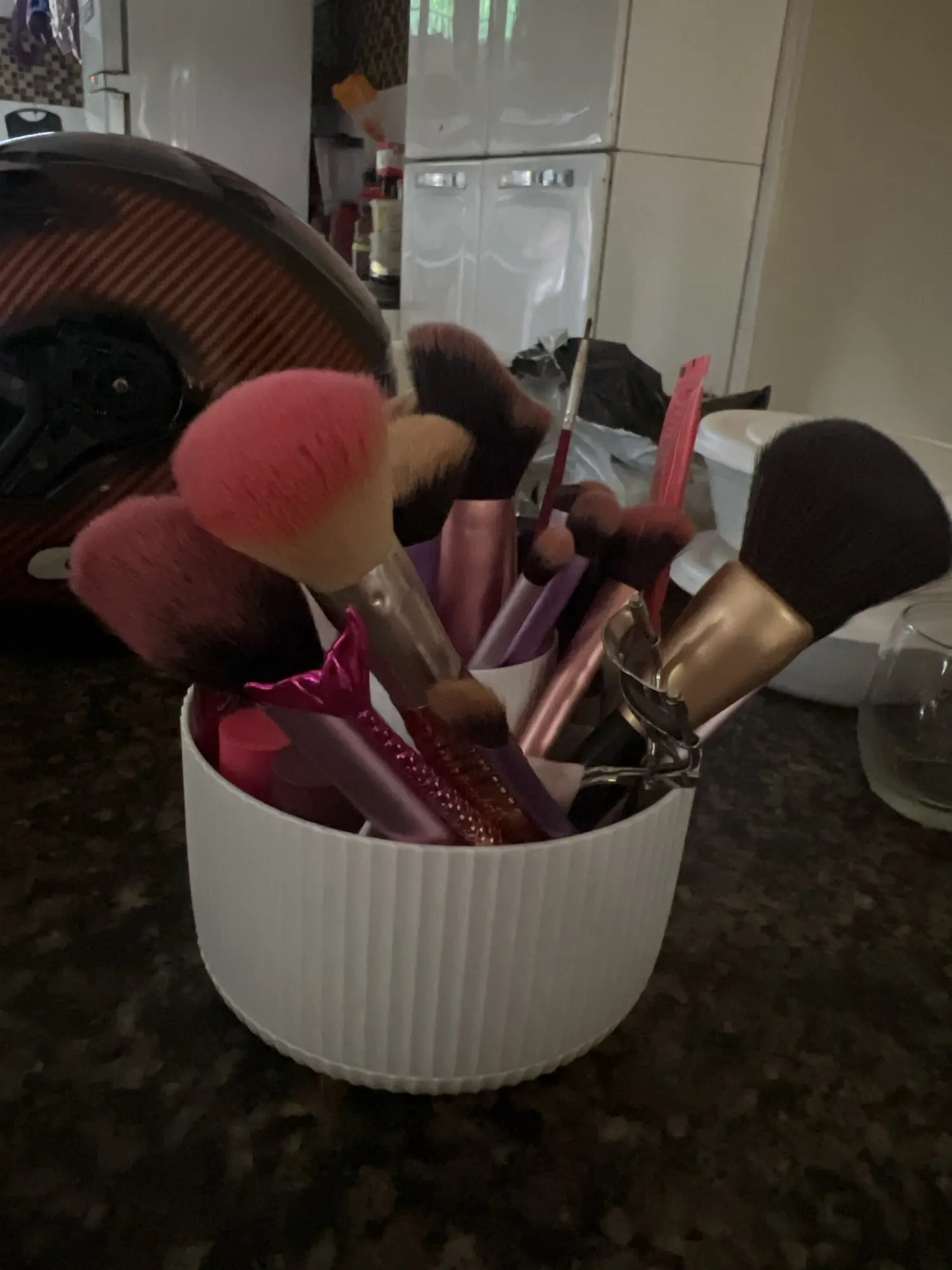 Scenario 2: The classic look makeup brush holder organizer feature fashionable vertical stripes design and gold-plated feet to protect the desktop from wear, must be a beautiful and fashionable presence on your vanity.